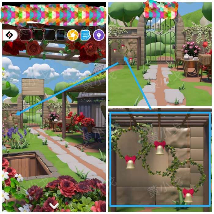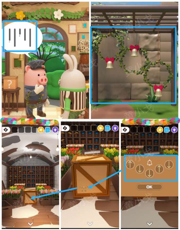 19.点击箱子上的密码锁,根据上面的铃铛图案提示,结合该场景铁门旁边的架子上的花环高度及铃铛位置和[大门]场景猪猪说的话,调整密码锁