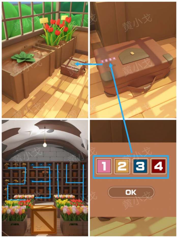 21.点击左侧花圃旁边的地上的行李箱上的密码锁,根据上面的颜色提示,结合[后院]场景架子上的花盆线索,输入密码:1234