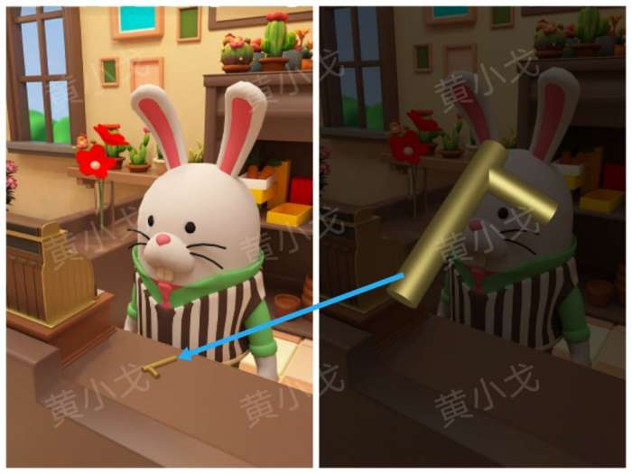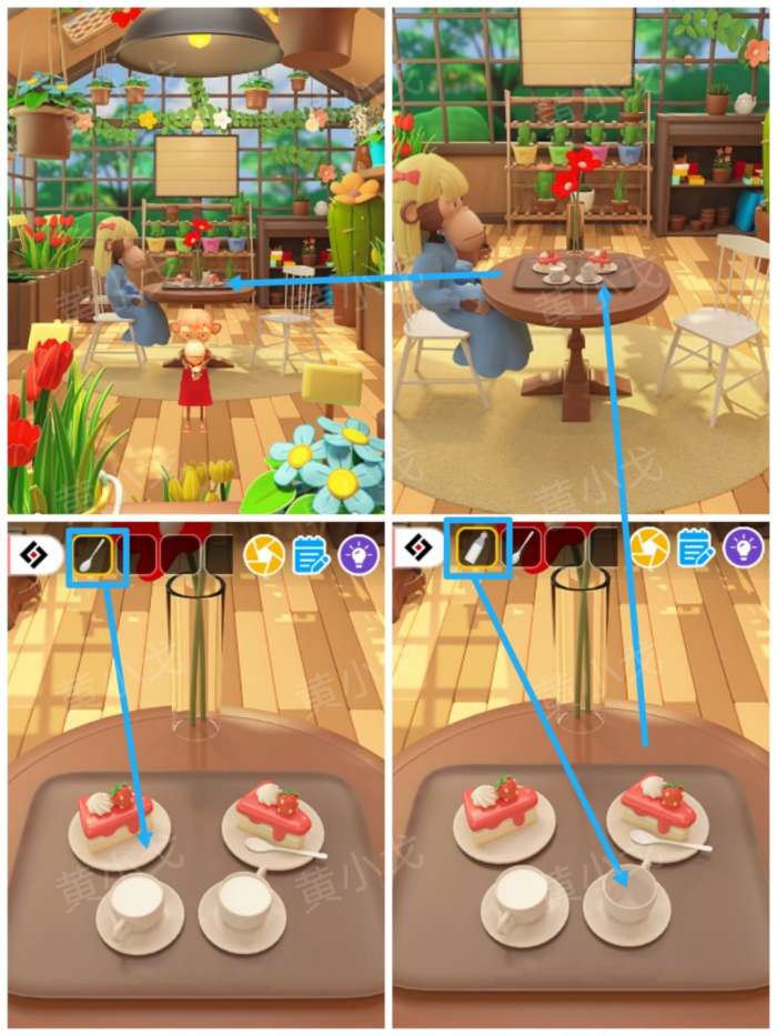Escape Room密室逃脱:花香工坊图文攻略(二),进入甜品坊拿【隔热手套】给猪猪,猪猪给客人上甜点,然后点击餐桌上的甜点,把【牛奶】倒入空杯子中,放上【勺子】,客人吃完去柜台结账。