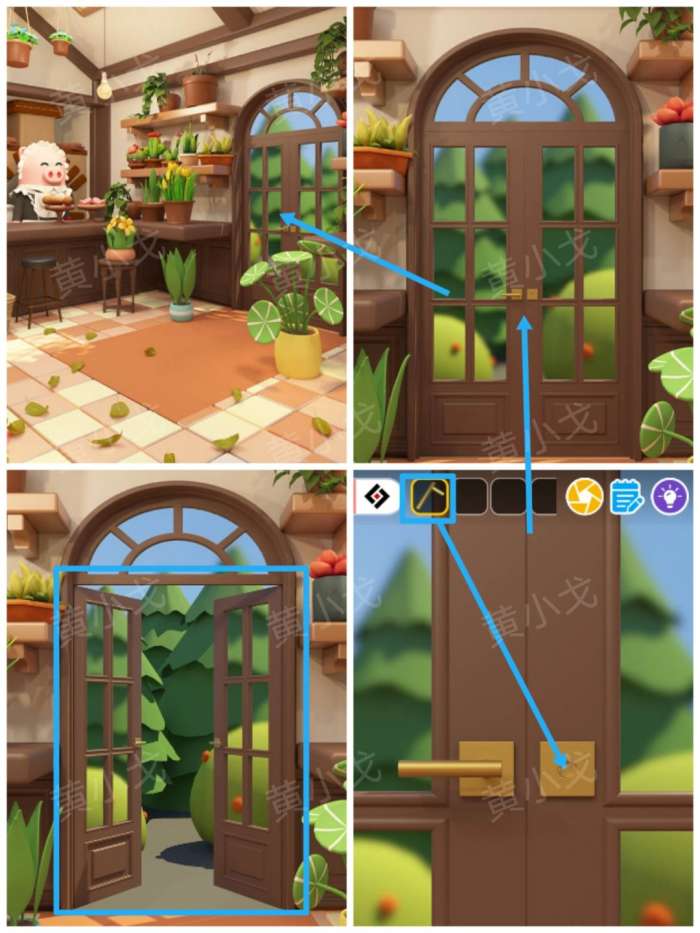 5.点击右侧的门,装上【把手】,打开门,去到后院