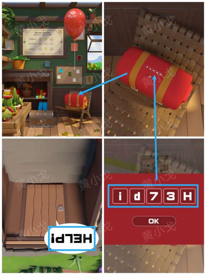 11.点击凳子上的背包上的密码锁,根据[后院]场景地窖门上的线索,输入密码:id73h