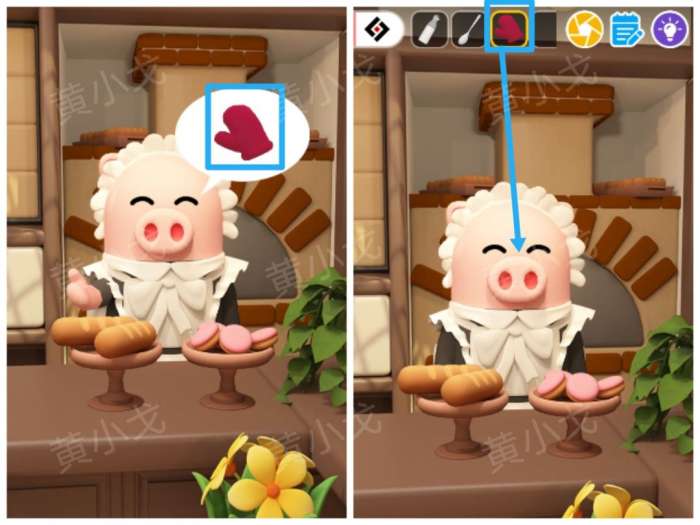 1.拿【隔热手套】给猪猪,猪猪给客人上甜点