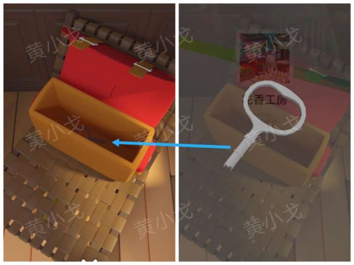 8.点击凳子上的箱子上的密码锁,根据[手工坊]场景胶布大小线索,调整密码锁