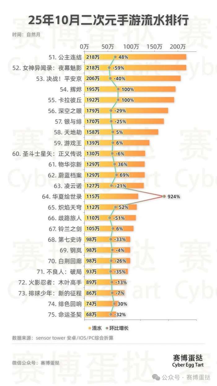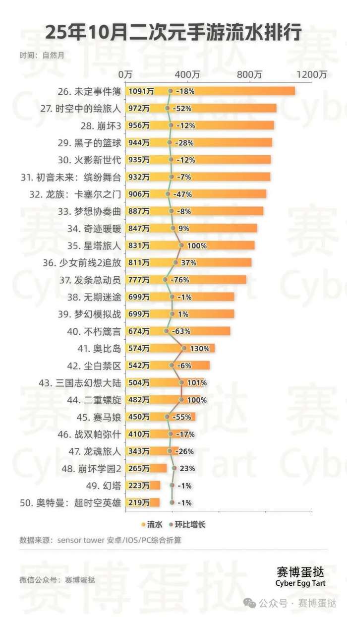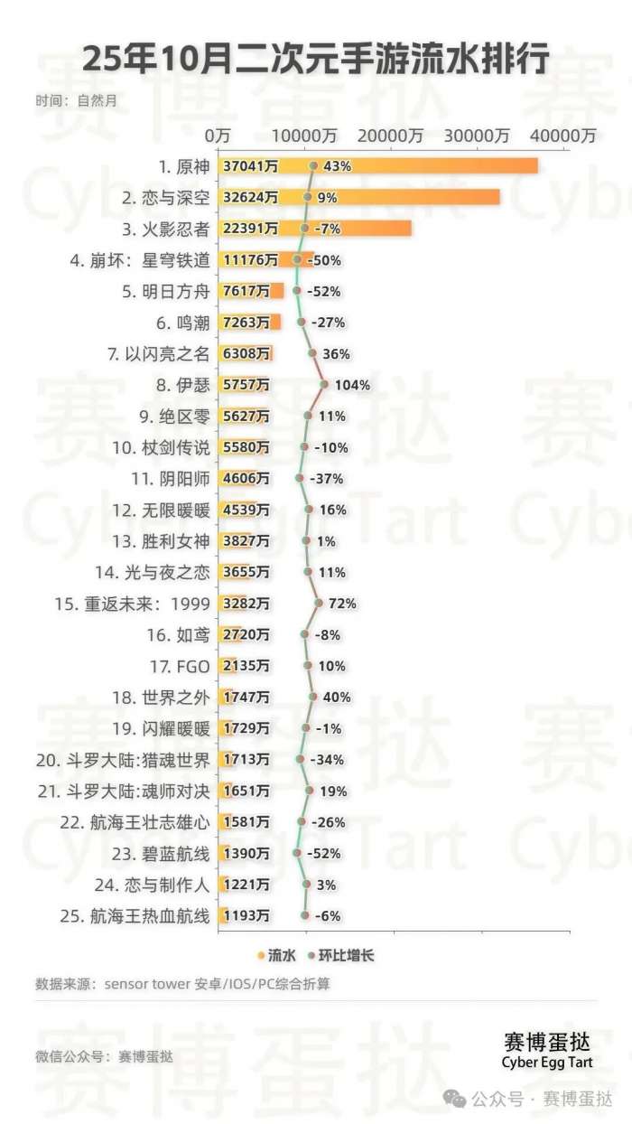 25年10月二次元手游流水排行!原神登顶领先恋与深空!伊瑟、重返未来1999、世界之外等涨幅居前!
