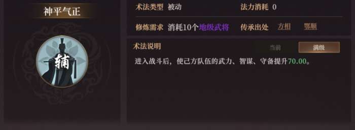 来自方相、鄂顺。进入战斗后,同时提升己方队伍的武力、智谋和守备。一眼可见是为智武双修体系准备的。比如传道武将方相自己就可以带。