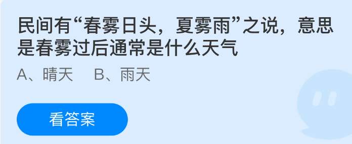以上就是民间有“春雾日头,夏雾雨”之说,意思是春雾过后通常是什么天气?支付宝蚂蚁庄园2026年3月25日答案最新,更多相关攻略,请关注pk游戏网更新!