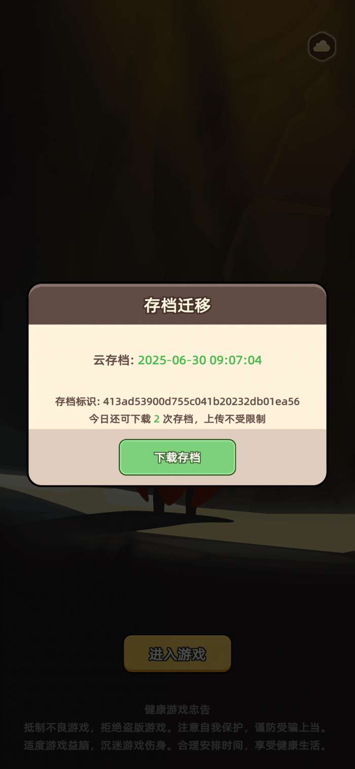 在游戏启动界面点击右上角的【云朵图标】,进入存档迁移页面,进入后只会看到【下载存档】按钮,可在这里下载云存档作为本地存档。