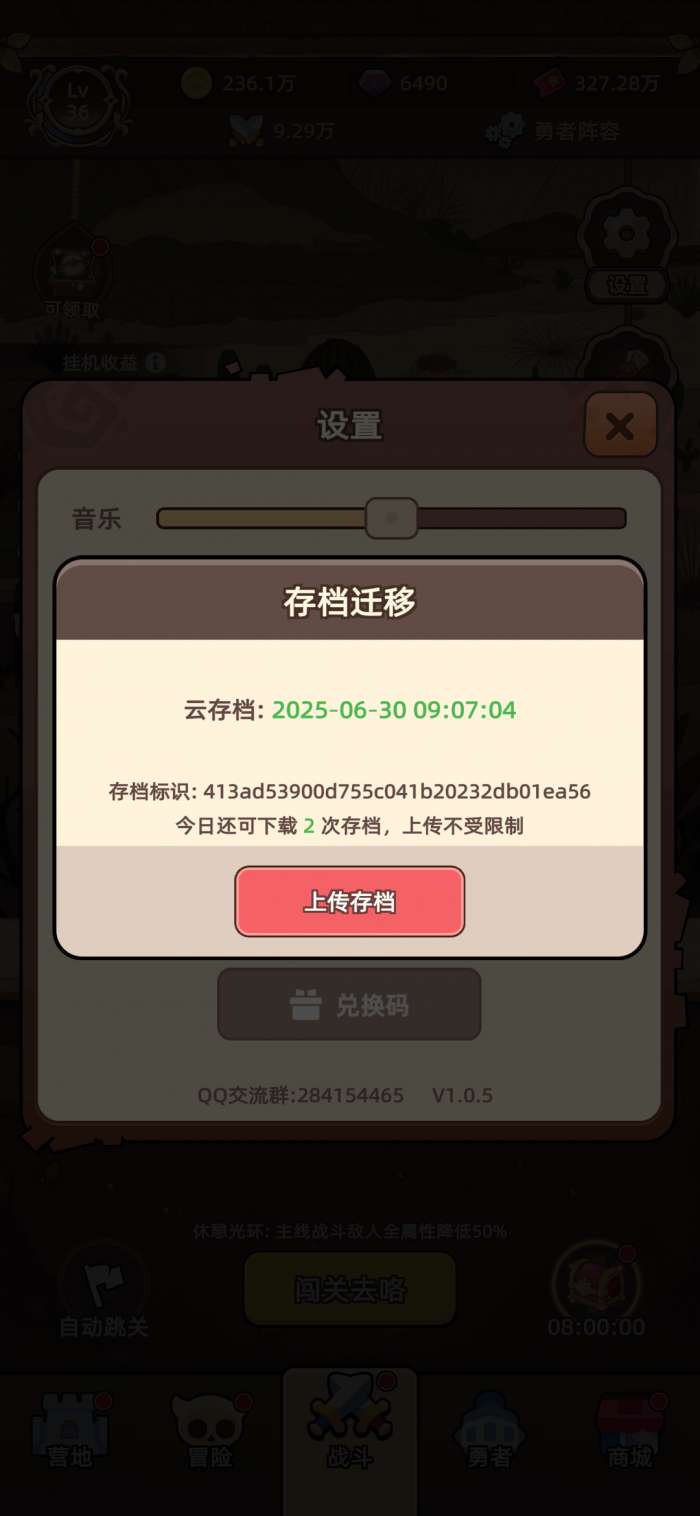 勇者不能停为玩家提供了云存档功能,方便玩家更换设备时迁移存档。在游戏内点击【设置】-【上传存档】,进入存档迁移页面,进入后只会看到【上传存档】按钮,可在这里上传本地存档作为云存档。