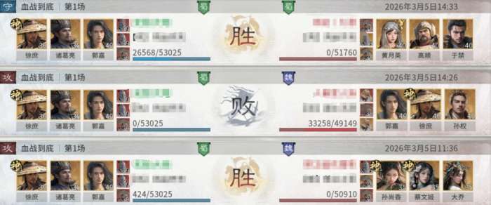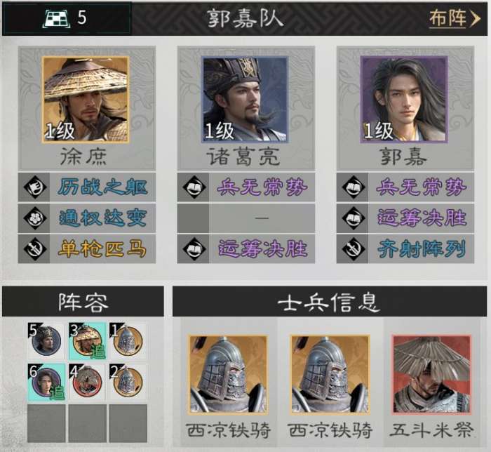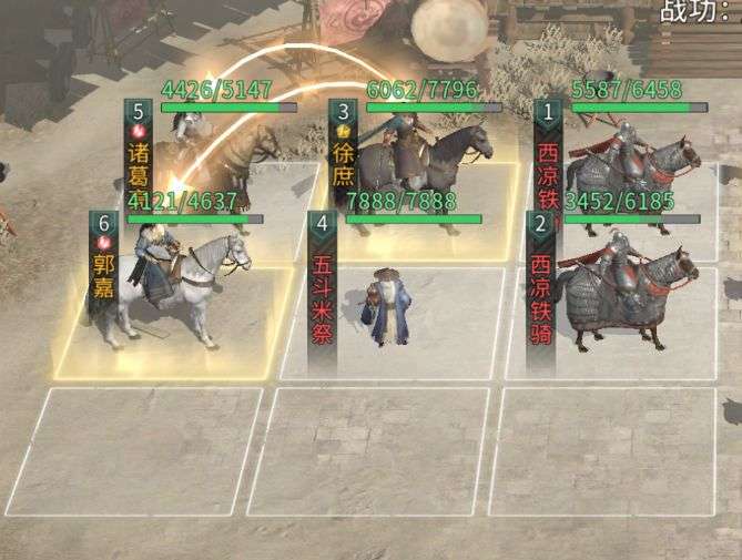 兵种站位:上两行的前列放置两名西凉骑兵抵挡伤害,在徐庶下方放置一名五斗米祭。