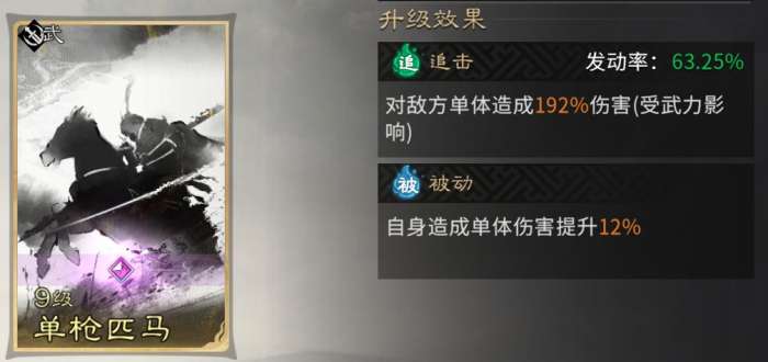 被动技能固定携带【单枪匹马】,提升自身造成的单体伤害,徐庶所有伤害都能完美吃到【单枪匹马】的伤害加成。