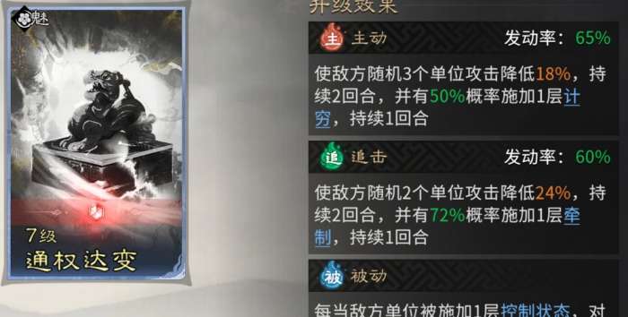 追击技能固定携带【通权达变】,使敌方随机2个单位攻击降低24%,持续2回合,并有72%概率施加1层牵制,持续1回合。