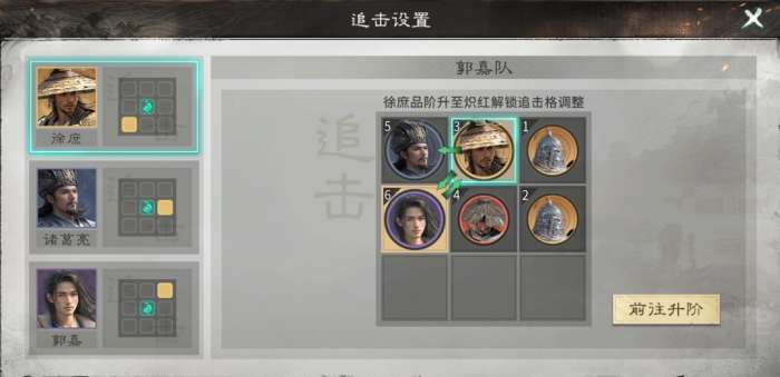 英雄站位:诸葛亮不站追击格,徐庶站诸葛亮的追击格,并与郭嘉互站追击格