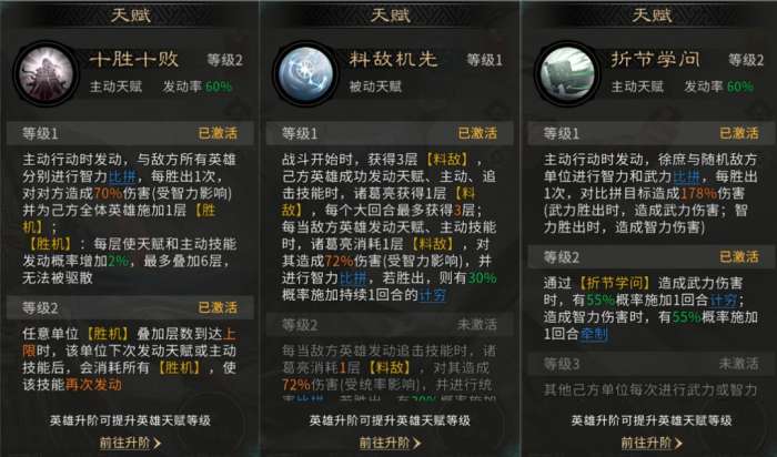 诸葛亮的天赋【料敌机先】,当敌方发动天赋或主动技能时,诸葛亮消耗1层【料敌】,造成伤害并进行智力比拼,胜出则概率施加1回合计穷;若敌方发动追击技能,消耗1层【料敌】造成伤害并进行统率比拼,胜出后概率施加1回合牵制。