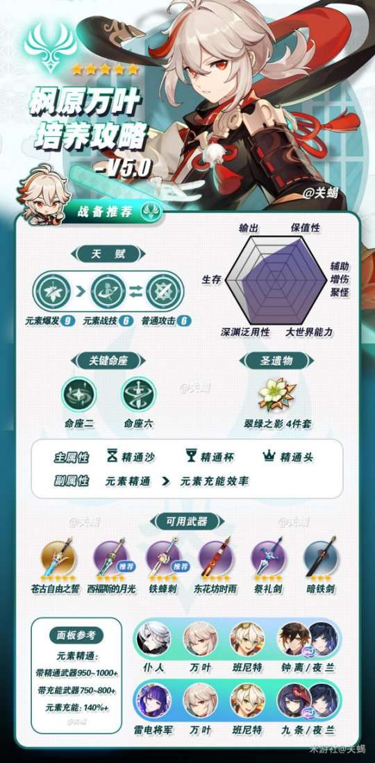 在纯辅助情况下,你的天赋技能不需要升级,只用一身精致的风套装备,即使副词条不是最优,再加上铁蜂刺,也不需要进行精炼,就能靠自身的天赋增幅机制让你的队伍大大提升伤害并减少敌人的抗性。只要你的队伍主要使用火/水/雷/冰属性造成伤害,万叶就是你的首选队友。