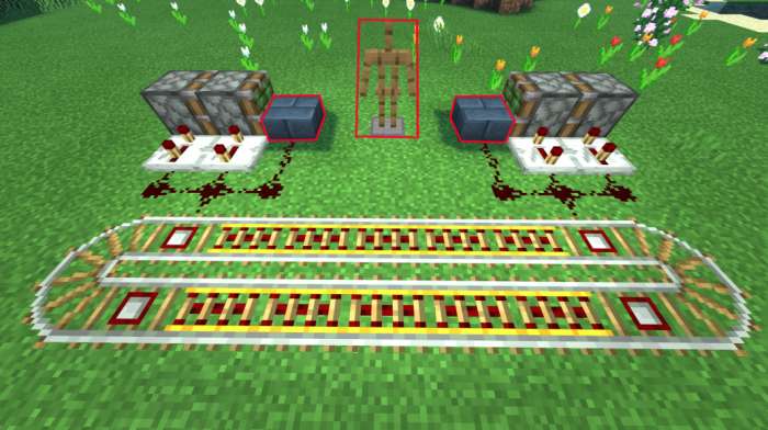 我们先在铁轨上推动矿车试试效果,可以看到盔甲架在两边活塞的推动下,在中间三格内不断地移动