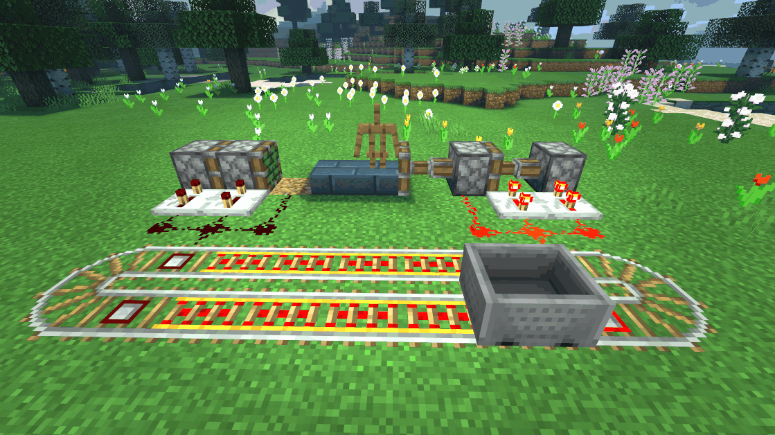 本期的核心原理非常简单,只需要一组无限循坏的铁轨,其中用到的探测铁轨会在矿车经过时发出红石信号,这样就可以不断地触发红石机关啦~