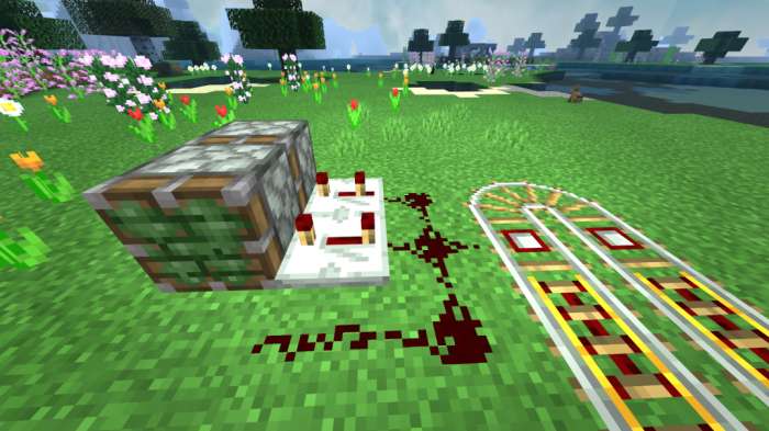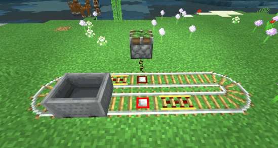 如果觉得地表的红石线路太过杂乱,也可以在探测铁轨下面挖一格,把红石线路隐藏起来,这样就可以更灵活地铺设线路了