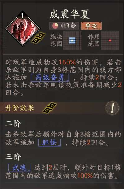 优质的通用技能,前期搭配<青龙斩月>可实现接近150%倍率无冷却技能连发,并且因为升阶技能只能携带两个,即使升迁满级也要携带这个技能,让自己在<威震华夏>冷却期内不会无技能可用。