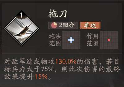 若不能击杀敌军:推荐先使用<拖刀>(对当前兵力大于75%的目标,有额外15%的伤害结果增幅),再使用<青龙斩月>击杀目标,加速缩短冷却期。