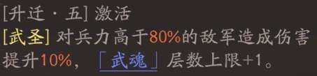 升迁10时,让起手输出更暴力,而且缩短了<再行动>的冷却期。开局即可完成一动击杀杂兵,再动直接触发<威震华夏>的额外效果,实现单人首回合最多可击杀6个目标的壮举。