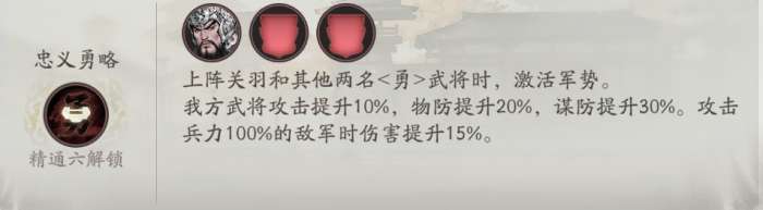要求关羽和其他2名<勇>主将同时上场触发,3名<勇>主将阵容单一容易导致己方被敌军属性克制而陷入被动局面,并且增伤仅针对满血敌军生效,因此不太推荐。