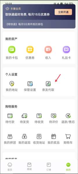 1、打开丰巢app,选择下方菜单栏、我的,选择“个人设置”功能模块中的“亲友代取”。