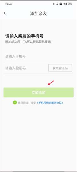 3、输入你亲友的手机号和验证码,勾选《手机号绑定服务协议》,最后点击立即添加就行啦。