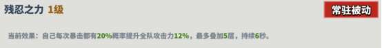 描述:自己每次暴击都有20%概率提升全队攻击力12%,最多叠加5层,持续6秒。