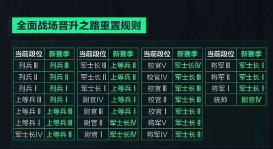 校官段位:校官Ⅴ至校官Ⅱ的玩家将分别被重置到校官Ⅳ至校官Ⅰ段位。