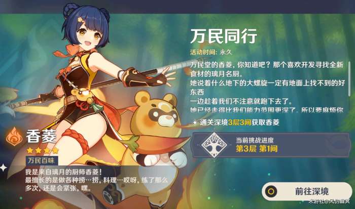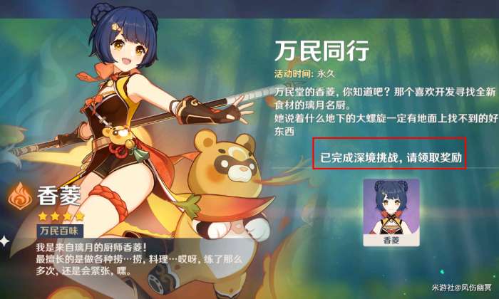 【香菱】冒险等级20级,开启「深境螺旋」后,无需满星通关3-3可领取;