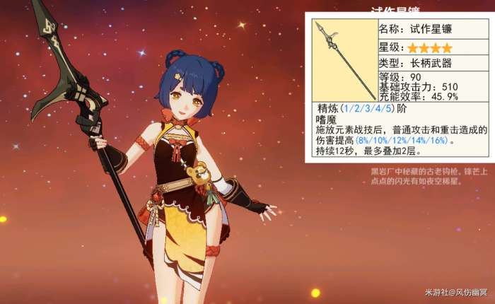打完3-3刚好有一个枪胚!刚好香菱可以使用,拼命去挖矿吧!锻造这把枪,特效虽然没用,因为也不用香菱站场,但副词条是充能,可以加快大招的使用频率!是香菱暂时最适合的武器了。