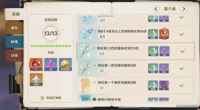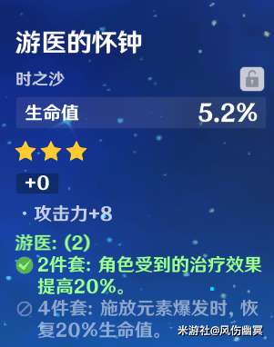 然后圣遗物方面,有些可以在冒险手册的见闻里获取。这里有一整套四星的少女套,获得后不要去管什么属性,直接戴就完事了。如果主属性是生命值和治疗加成的,直接强化,能几级就几级。后期都是当狗粮的,或者你操作够好,不强化也行,小奶一点罢了,还省资源。
