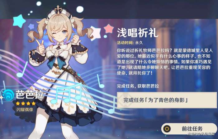 玩到冒险等级18,可以做完温迪那条线的「为了青色的身影」任务,即可白嫖的「奶妈」角色,就是开启「风龙废墟」的那个任务。