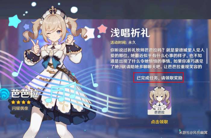 你的冒险等级到20了,可以去领取香菱了!!各位小伙伴18级时应该都领过「芭芭拉」了!打完任务中的风魔龙的话。