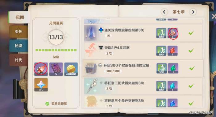 达成以上条件,就可以留着树脂打四个角色需要的四个boss了!!还可以获得圣遗物,有好的刚好可以换上,出四星五星更好。