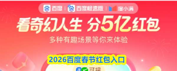 2026年百度APP春节红包活动已开始。用户可搜索“春节红包”参与:体验“奇幻人生”AI互动并集卡,前1000名集齐5张稀有卡可赢最高万元现金;每晚20点还可通过文心助手猜口令抢隐藏红包,最高得1088元。活动持续至2月24日。