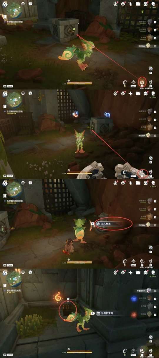拉拽两次牵引钩使幻写灵达到指定位置,然后注入燃素,击败苏醒的魔物,击败之后获得一个燃素球(小峭锋龙很喜欢),并且解锁头顶的珍贵宝箱。