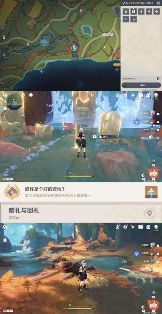 大家可以通过前往对应点位进入「歇息处」,第二次进入会获得成就「或许是个好的营地?」,并且触发龙选者的旅途任务之一「赠礼与回礼」(大家自行探索,若涉及宝箱解谜的话会有对应攻略),以及我们刚所得到的燃素球的位置(纳塔任务中我们会得到很多歇息处的摆件)。