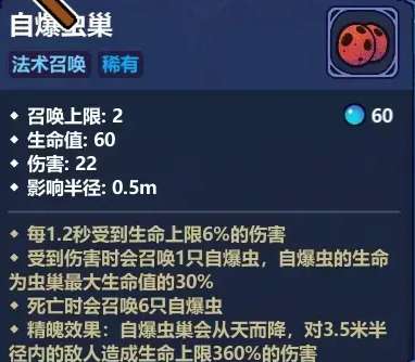 新版聚爆虫巢流派以【自爆虫巢】与【精魄】为核心,通过【范围增强】扩大爆炸范围,并堆叠生命上限与【精魄】数量来大幅提升伤害倍率。该搭配可对多数BOSS造成落地瞬秒效果,清怪效率极高。