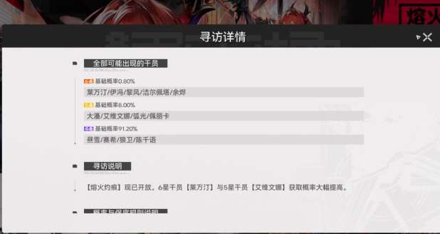 熔火灼痕卡池隶属于限时寻访的范围之内,解锁条件需要与玩家的主线任务进行关联,在完成指定的基础主线关卡之后就可以解锁并参与寻访,卡池的参与方式主要分为两种,既可以使用专属的寻访凭证进行兑换抽取,也支持消耗游戏内的通用货币直接参与,玩家可以选择自己最适合的方式来抽取,跟游戏内的常规常驻卡池相比,熔火灼痕卡池的核心差异就在于对特定星级干员设置了更高的概率提升机制,可以提高玩家获取核心目标干员的可能,卡池具备独立的保底技术机制,在后续可以帮助玩家累积寻访的进度。