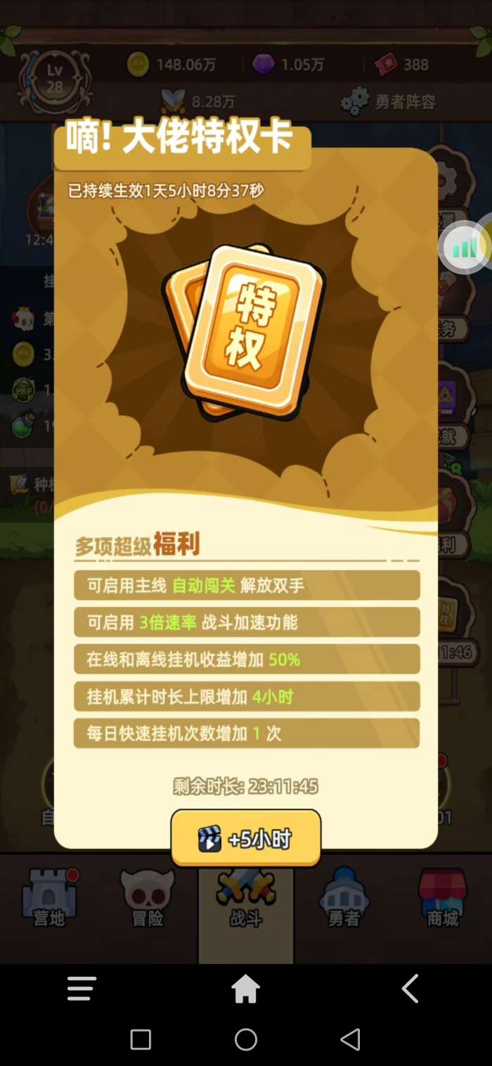 战斗闯关:就开着特权卡,无脑挂机,推关就好了,打不过就沉淀一下,强化强化装备,搭配下套装,升级勇者,和勇者技能,没事挂会机,收收菜就好了,还是很佛系的。