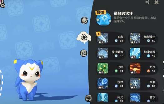 里面有两个核心的功能,技能学习,就可以让精灵学习到各种特殊的技能。技能调整,还可以针对精灵已经掌握的技能去搭配。精灵一共可以装备四项技能,在合理搭配之后,就可以发挥战斗力。这里就给大家新手分享一套实用的技能搭配思路,首先就一定要保留一个零消耗的技能。野外对战的时候变数很多,一旦星星消耗,那么零消耗技能就可以直接避免无技能可用的尴尬局面。另外可以搭配两个1~2星的消耗技能,这类技能消耗比较低,实用性较强。