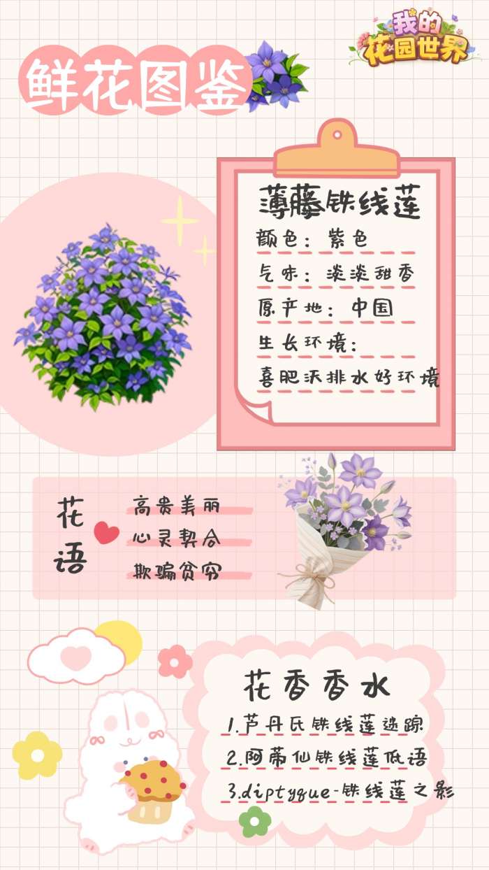 我的花园世界薄藤铁线莲图鉴:薄藤铁线莲花色淡紫,散发淡淡甜香,原产中国。它喜肥沃且排水良好的环境,花语象征高贵美丽与心灵契合。其独特香气也为多款小众香水提供了灵感。