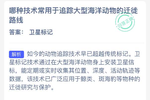 哪种技术常用于追踪大型海洋动物的迁徙路线?【神奇海洋】12月22日新题目已开答!正确答案现已公布,点击领取拼图,一起为修复海洋生态贡献力量!今日正确答案是:【卫星标记】。卫星标记技术常用于追踪大型海洋动物的迁徙路线。