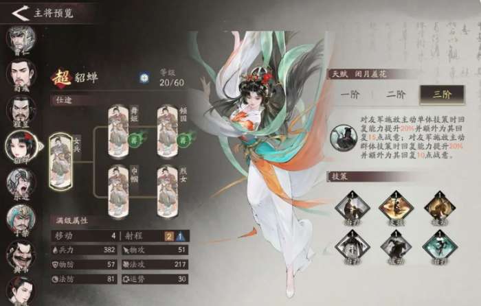貂蝉应该是目前游戏中比较具有战略意义的辅助角色,她拥有全游戏为数不多的赋予友军在行动的能力,这里需要注意区分,游戏中有不少角色拥有再移动技能,但是再移动只能够用来走位不能够再次攻击,而貂蝉的再行动则是让队友完整的再打一回合,可以说直接再次复制一次战斗流程,非常的强力,除此之外,他还能够为队友提供范围治疗,可以说是目前游戏里最全面,也最值得投入的辅助角色之一,但是目前只能够通过卡池外出,所以说可以抽到她的话真是欧气爆棚了。