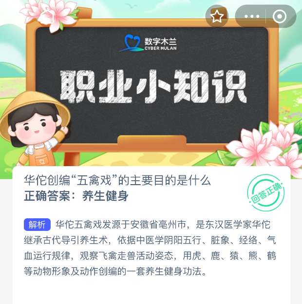 华佗创编“五禽戏”的主要目的是什么?【蚂蚁新村每日一题】2025年11月12日题目已发布!坚持答题,积累木兰币,即可加速小镇建设。答对本题,立即可享“产速+3/时”的加速奖励!今天正确答案是【养生健身】。华佗五禽戏发源于安徽省亳州市,是东汉医学家华佗继承古代导引养生术.