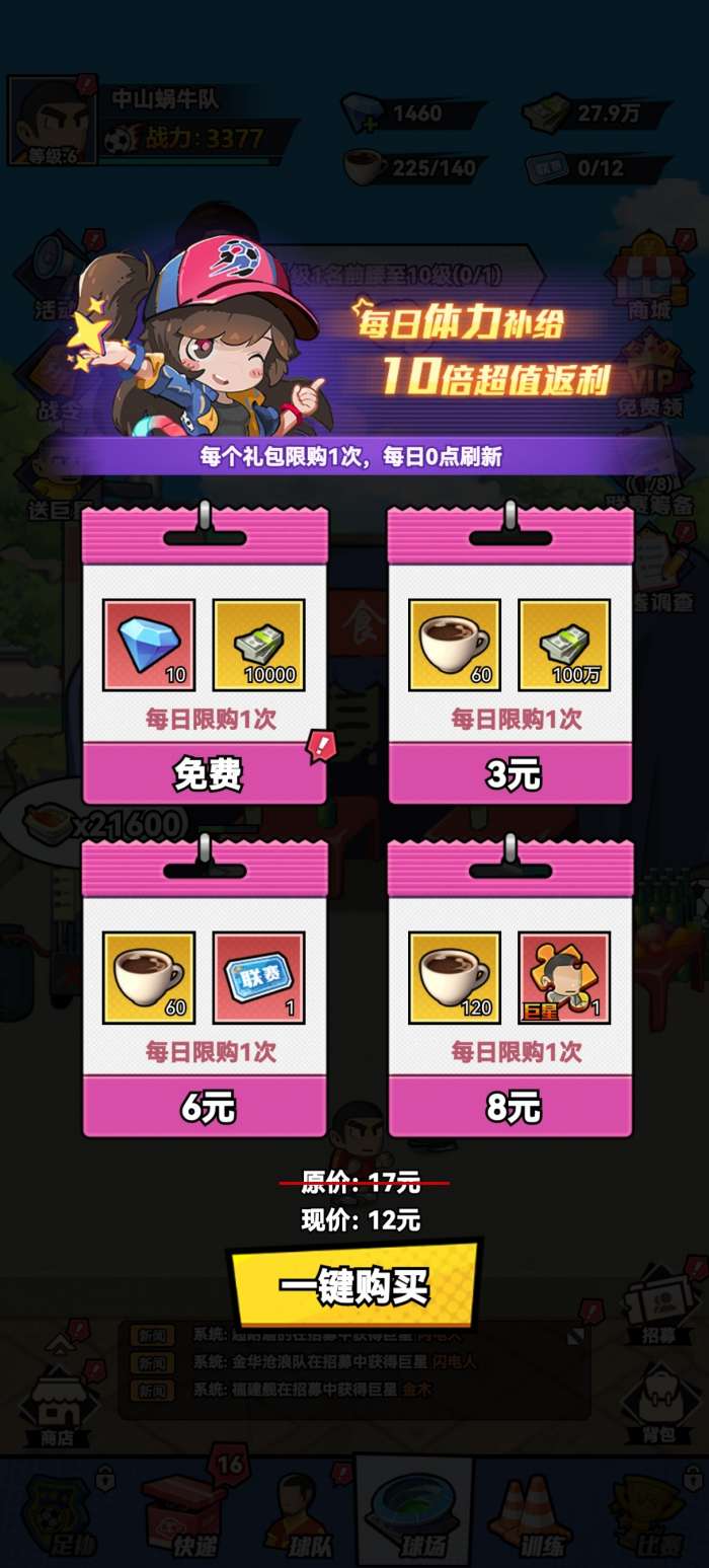 足球大人物钻石是游戏核心货币,主要用于招募球员。主要来源:7日签到、每日礼包、副本任务、充值及解锁图鉴等。核心用途为购买招募券(1500钻/10张),亦可在商店兑换体力、快递箱等资源,或用于副本扫荡获取材料。建议优先保障招募需求。