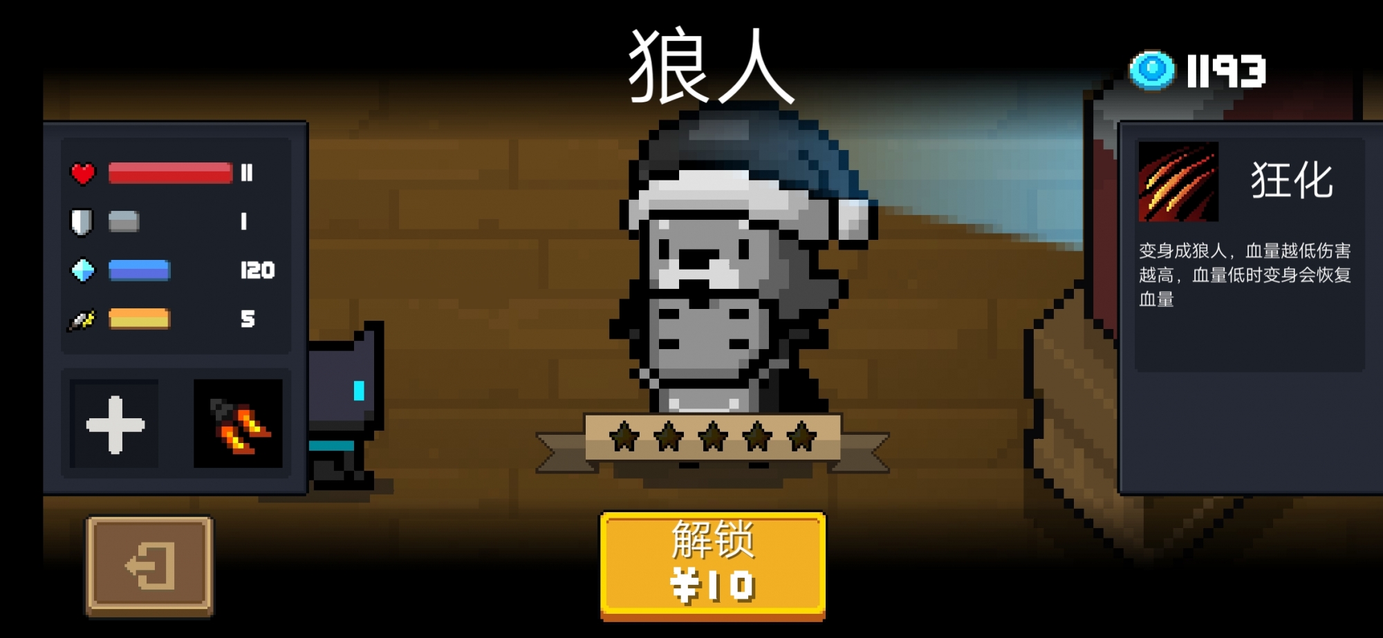 狂化:变身成狼人,血量越底伤害越高,血量低时变身会恢复血量。