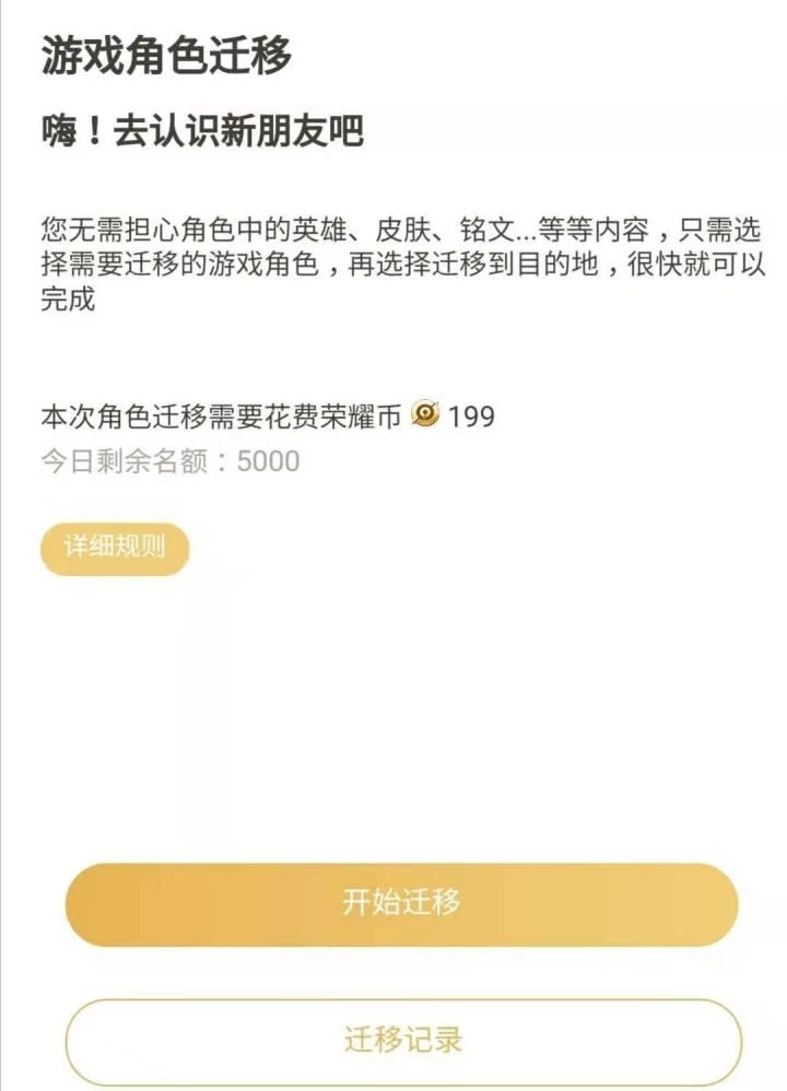 《王者荣耀》安卓迁移苹果功能介绍目前有王者营地疑似对一部分内测账户开通了角色迁移功能,只需要花费199荣耀币(19.9块钱)即可完成转区。不过好像目前只开放了安卓转苹果,并没有开放苹果转安卓,并且目前每天限额5000人转出。