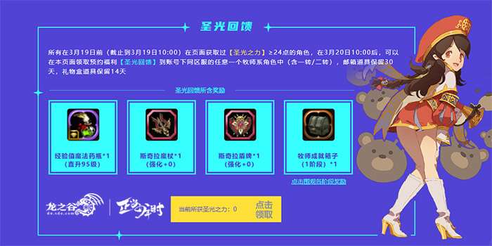 圣光之力除了可以在兑换商店中兑换道具外,如果谷迷们在3月19日早上10点前,拥有≥24点的圣光之力,那么在3月20日早上10点后,就能在《龙之谷》守护礼活动页面为自己账号下的牧师角色领取专属“圣光回馈”福利。直升95级?没问题!斯奇拉主副手武器?送给你!还有牧师成就箱子,完成每一个阶段的开箱任务,就能获得对应的奖励哦!只要参与活动的账号在同区服内有任意一个牧师系角色(含一转及二转),就能把这份大礼抱回家!